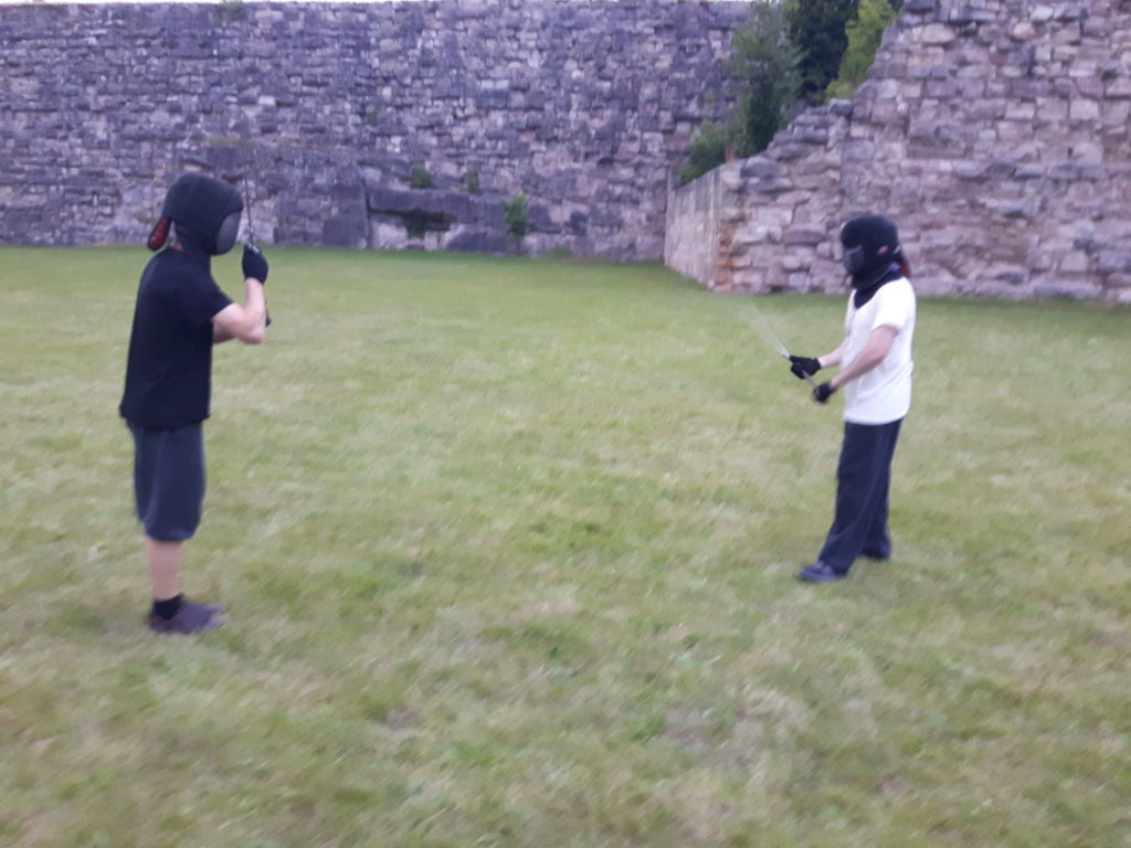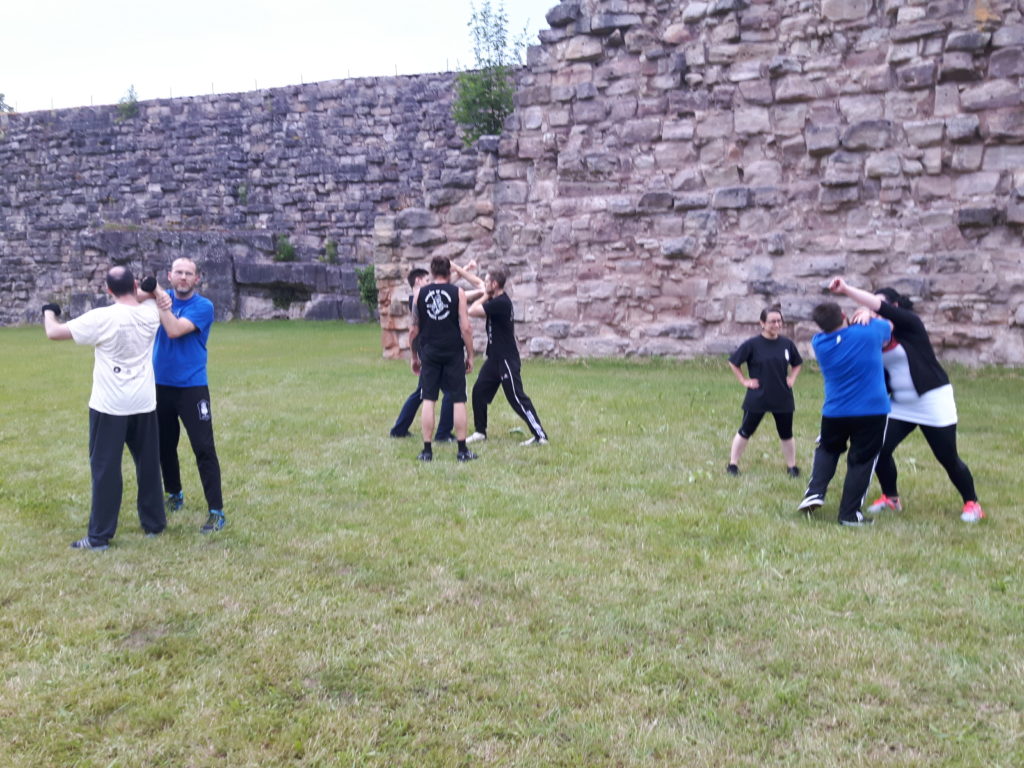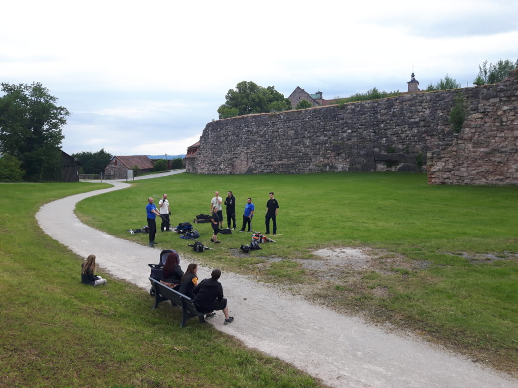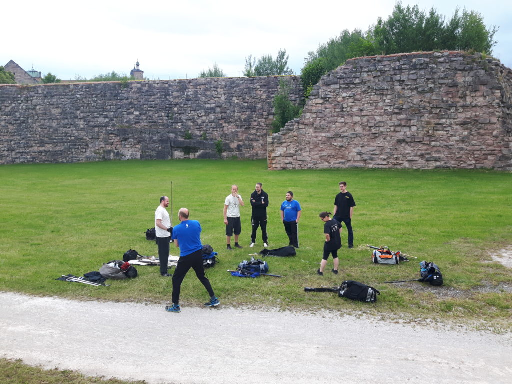 Nach einem reichlich verspäteten Aufbruch und einem Spontanbesuch bei Mr. Trainingsschwerter war unsere erste Station am Montag die Plassenburg, die malerisch über Kulmbach thront. Hier wurden wir von Benny Dippold, Obmann des ersten deutschen INDES-Ablegers Kulmbach und seinen Mitstreitern sehr herzlich in Empfang genommen. Trainiert wurde auf einer Freifläche hinter der Burg – eine kleine Einheit waffenlose Techniken und als Hauptgericht einen Satz Parade-Riposte. Augeklingen konnte der Abend bei fränkischem Bier in Bennys Heim. Vielen Dank für die Gastfreundschaft!