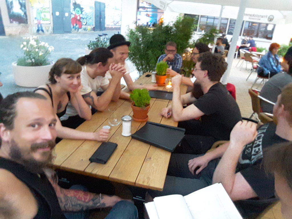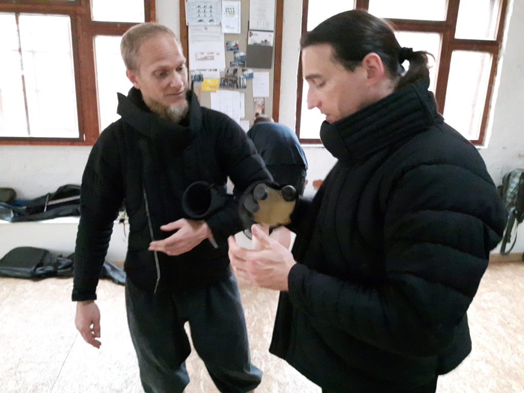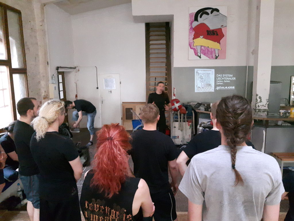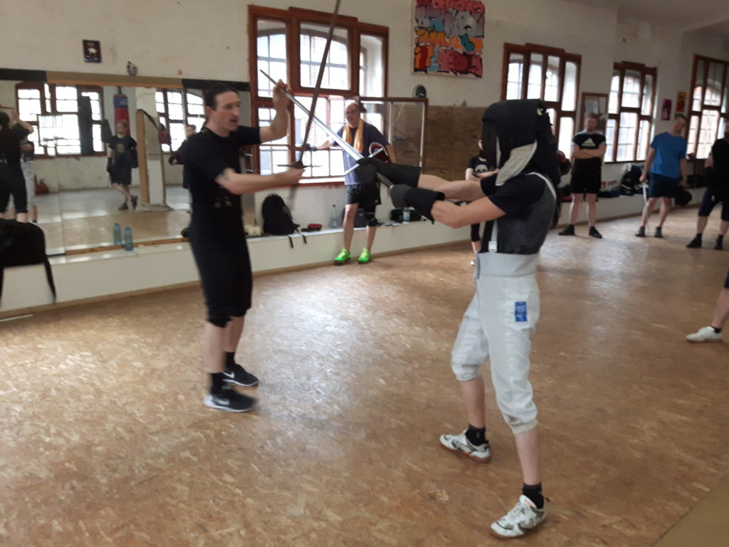 Gegen 19 Uhr dann Umzug in eine geheime Trainingshalle in Plagwitz, die uns mit ihrem Flair sofort in Beschlag nahm. Torstens aktuelles Dienstags-Seminar beschäftigt sich eingehend mit den Zahlen des Lichtenauer-Systems. Wir widmeten uns hier mit rund 20 Kursteilnehmern vor allem den magischen Begriffen “Stark” und “Schwach”, die Torsten in einer Einheit Krumphau gegen Oberhau und Krump aus der Bindung veranschaulichte. Hier trifft Background auf Physis – hat richtig Spaß gemacht.