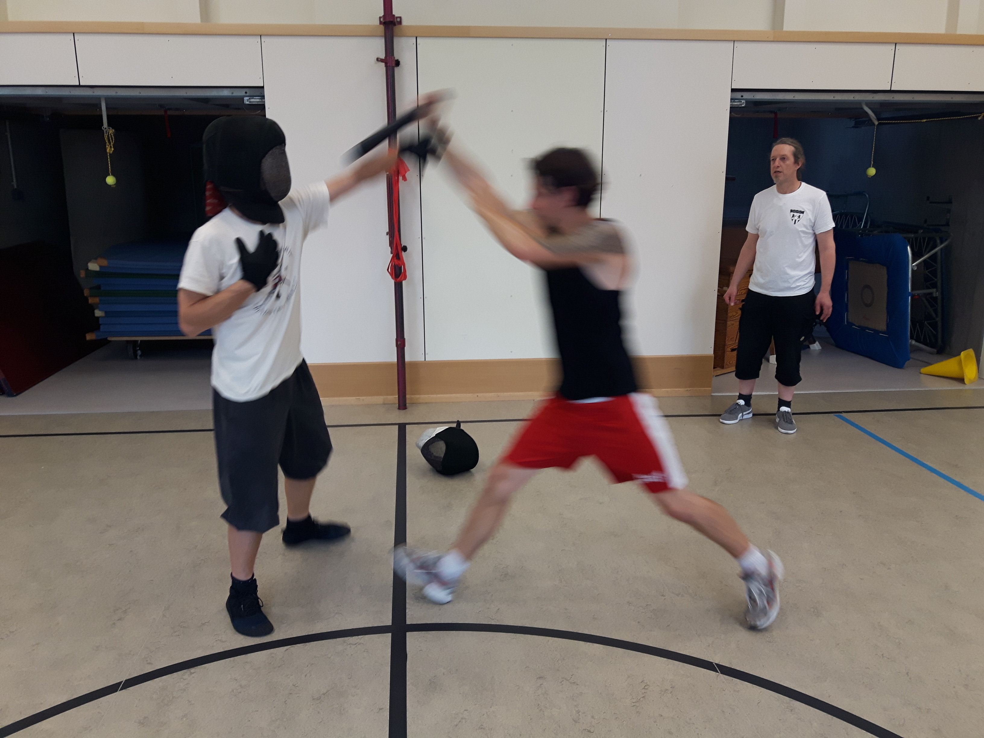 Wer dann noch den Arm heben konnte, bekam als Nachspeise noch eine Einheit Langes Messer serviert – hier relativ grundlegende Techniken: Unterhau gegen Oberhau, Oberhau gegen Oberhau und ein bissel Wecker. Beeindruckend, was Twerchhau auch hier im Sparringsbereich auf die Beine gestellt hat.