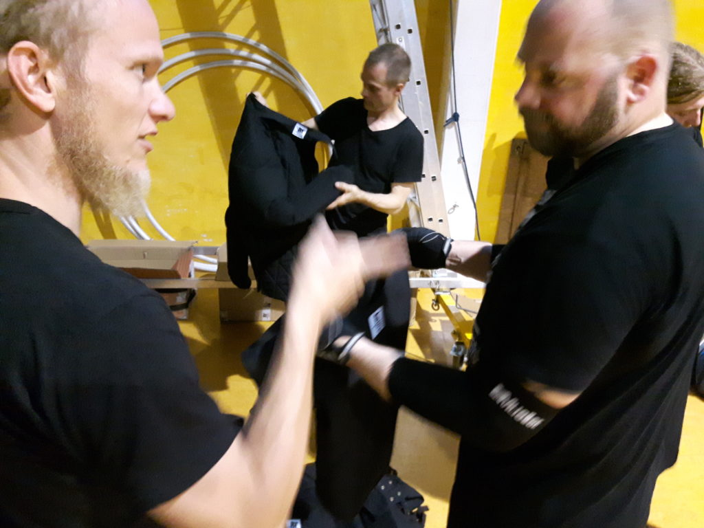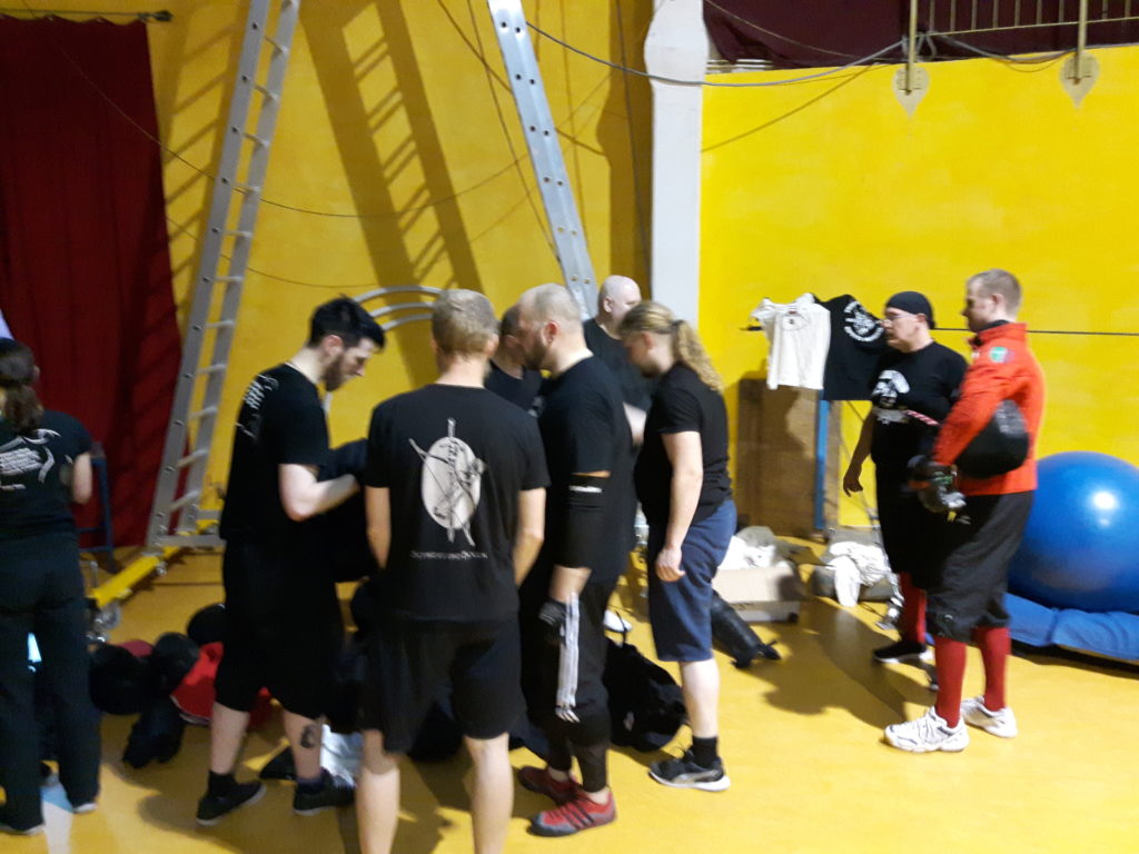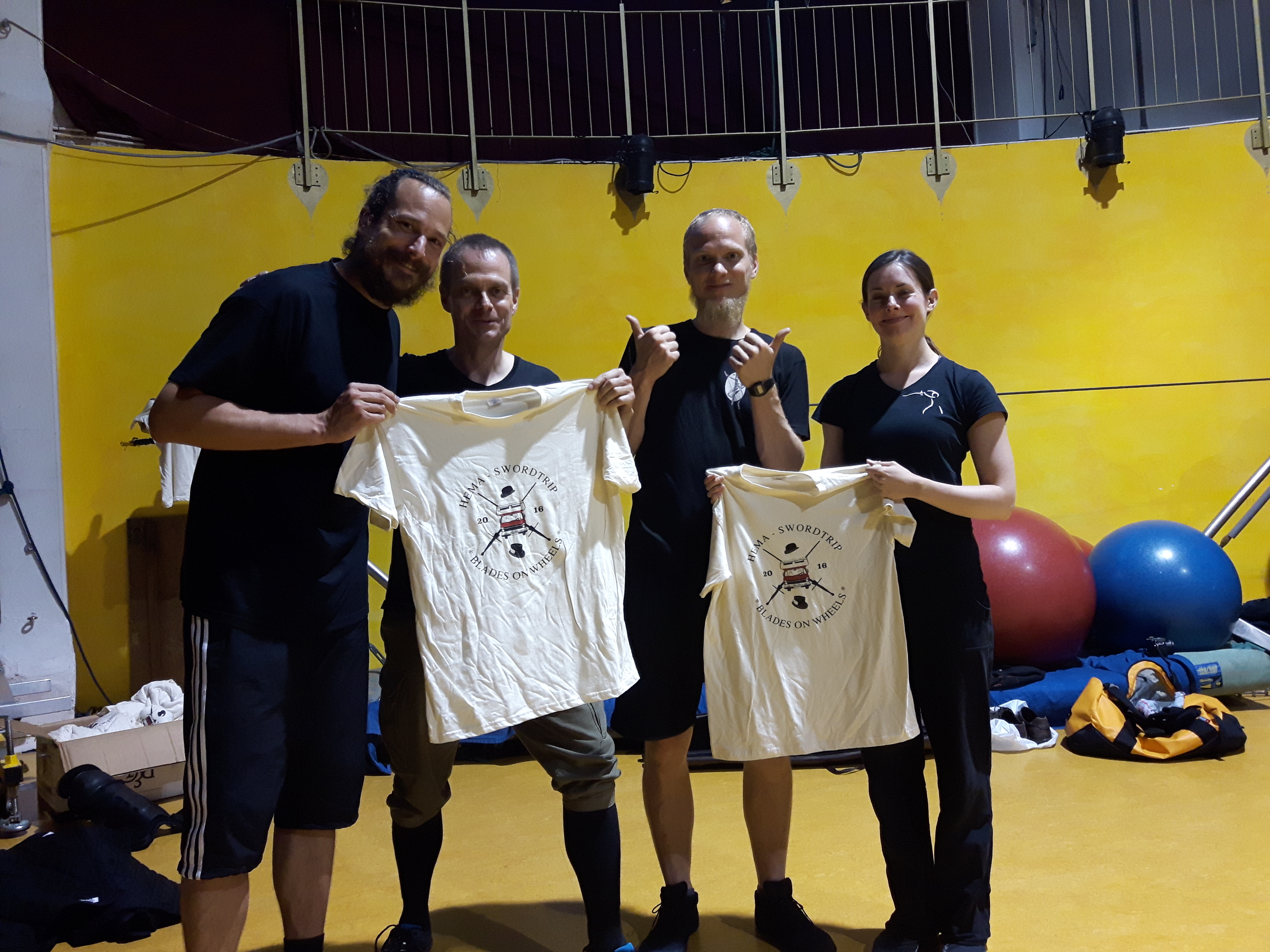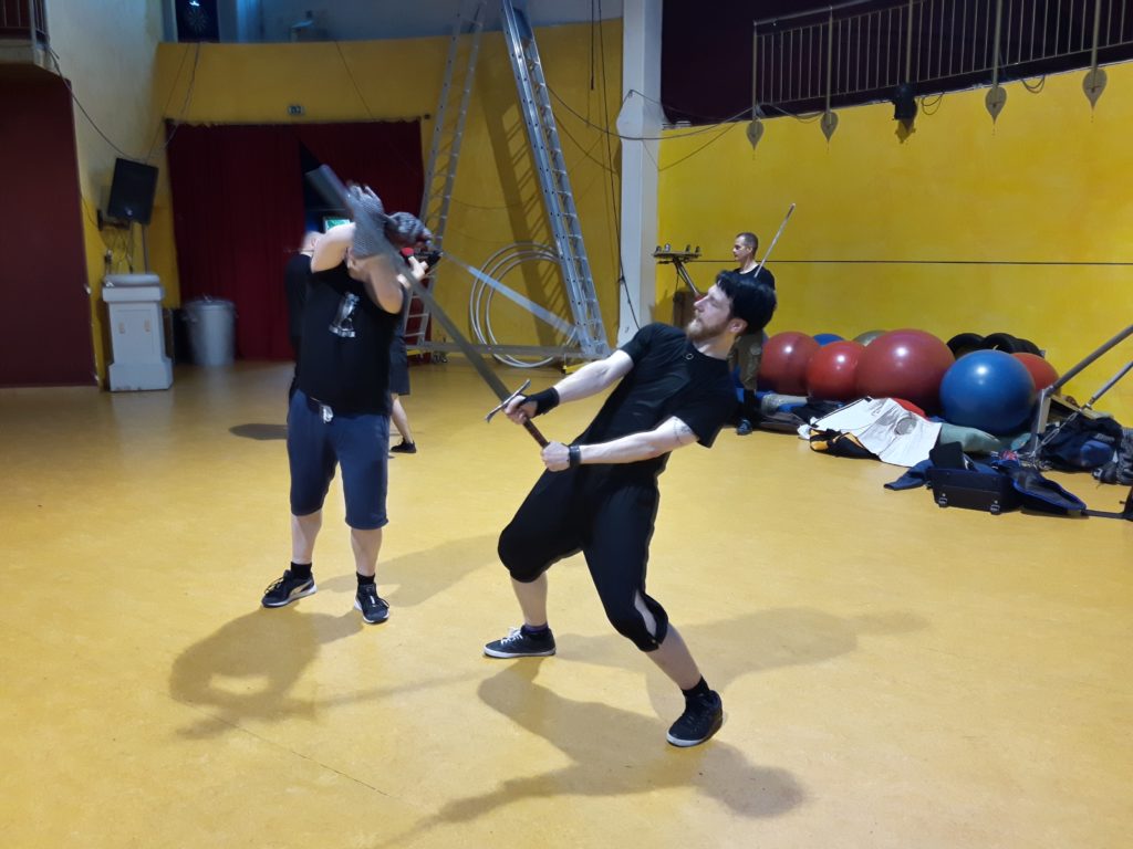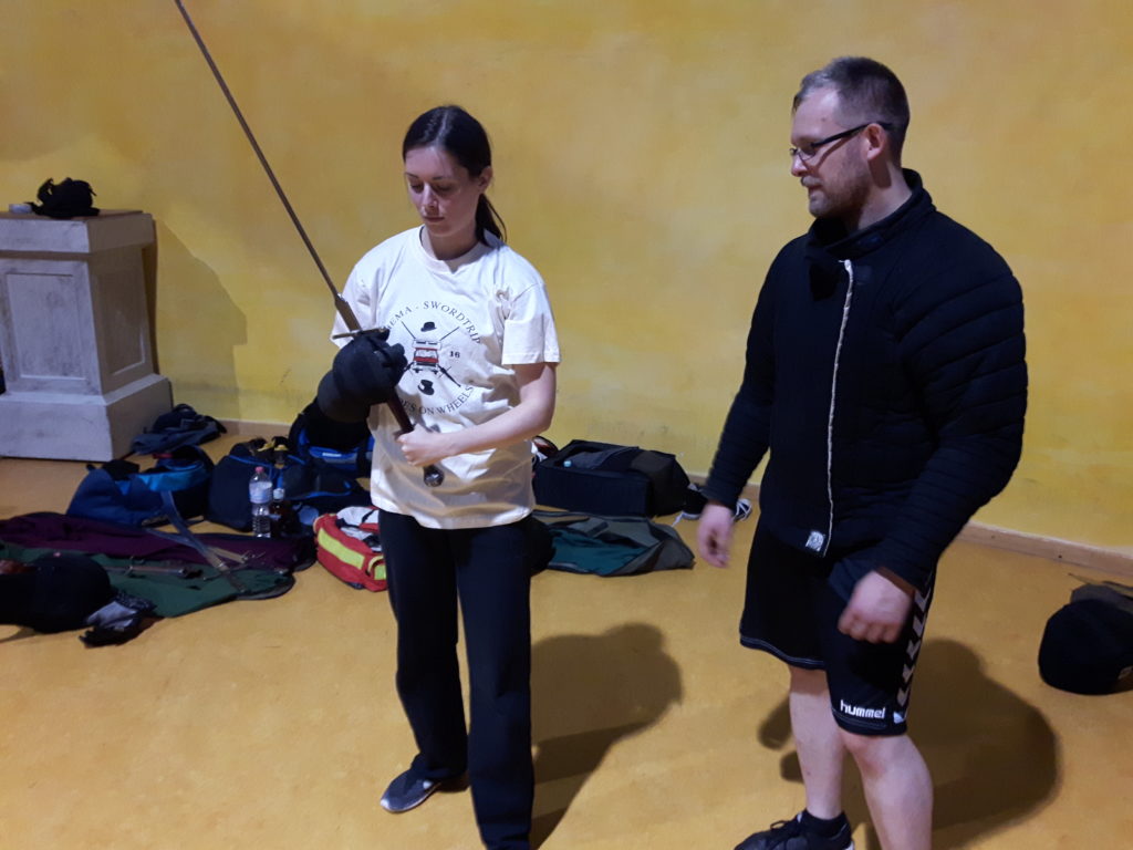 Wir wurden sehr freundlich von DDHF-Präsidentin Sonja Heer, selbst Trainerin bei Schwertfechten Nordhessen, in Empfang genommen und haben gleich in gewohnter Manier das präsidiale Wohnzimmer besetzt. Danach ging es in zwei Pkw in die Manege, wo rund 20 Fechter uns begrüßten und nach einem intensiven Aufwärmblock ein dreigeteiltes Training absolvierten. Das von Friedrich Lehmann angeleitete Langschwert-Training befasste sich intensiv mit einem Stück aus dem Codex Wallerstein. Im Anschluss bstand wie immer die Möglichkeit, die Ausrüstung unserer Sponsoren zu testen und unser tour-Shirt zu erwerben.