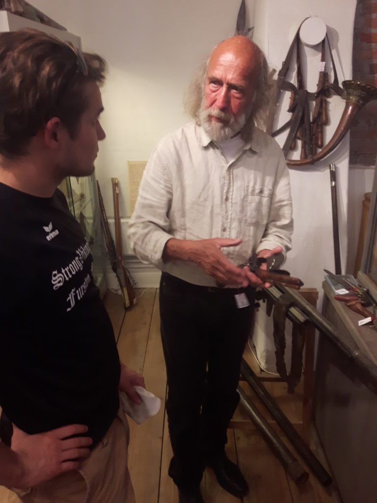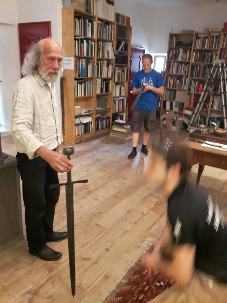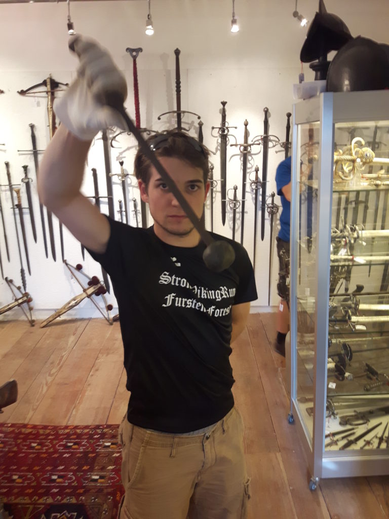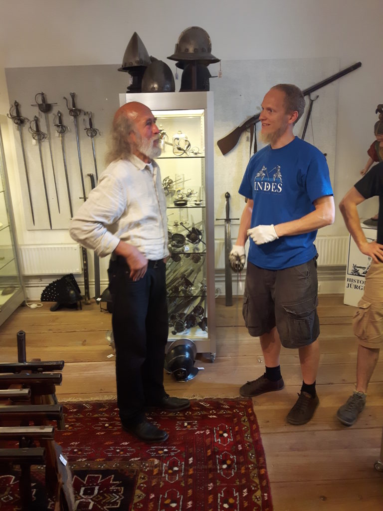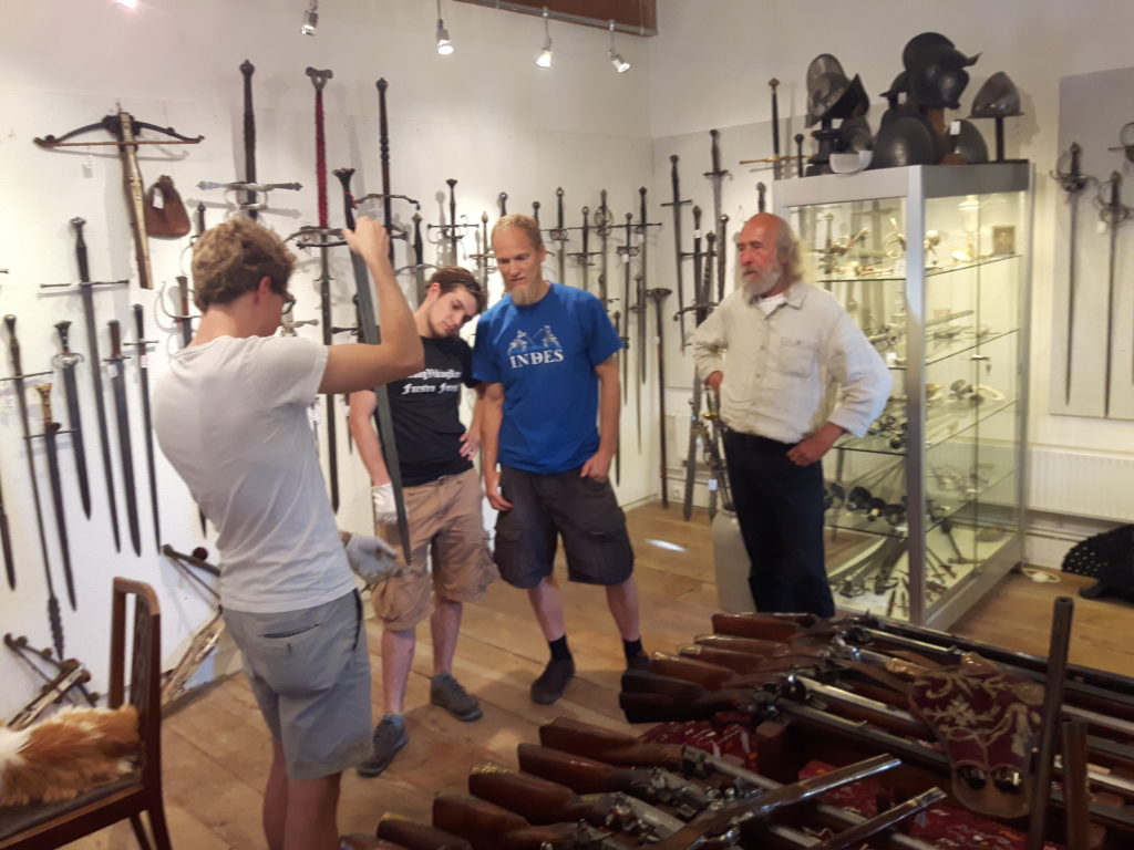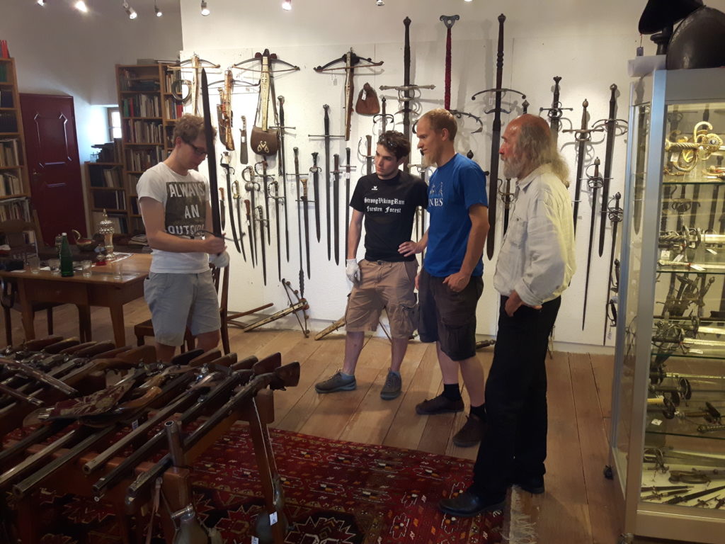 Jürgen H. Fricker hat seit seinem ersten Fund – einem halbverrosteten Säbel in einem Bach in früher Jugend – aus seiner Passion eine Profession gemacht: Er ist Sachverständiger für historische Waffen, Sammler und Händler. Getreu seinem Motto “Kunst ist die schönste Wertanlage” hat er in den vergangenen Jahren schon manch einem Schwertliebhaber zu einem originalen Sammlerstück verholfen und auch schon Museen von Deutschland bis ins ferne Japan bestückt. Jürgen öffnete seine Schatzkammer über zwei Stunden für die Swordtrip-Crew, die aus dem Sabbern nicht mehr herauskam. Anders als in anderen Sammlungen oder gar Museen hatte er auch keinerlei Berührungsängste, was das “Ausprobieren” von über 500 Jahre alten Originalen anbelangte… Worin das mündete, kann man sich vorstellen: Die drei Swordtripper und Schwertschmied Lukas Mästle-Goer (selbst HEMA-Trainer bei den Schwabenfedern), der als Verstärkung mit angereist war, probierten sich ausgiebig durch die Vitrinen. “Darf ich noch mal KURZ das xxxx da drüben??”, und “Eine letzte Frage habe ich noch…??” waren die beiden Sätze, die Jürgen gefühlte 100 Mal über sich ergehen ließ – und mit stoischer und freundlicher Contenance erwiderte.