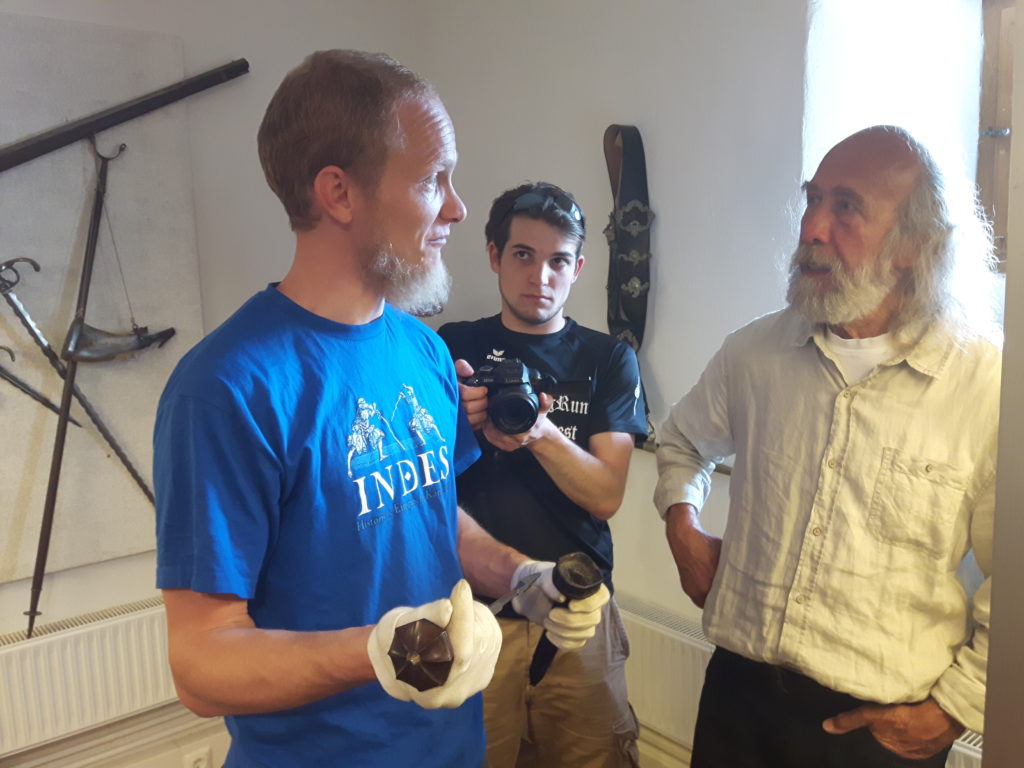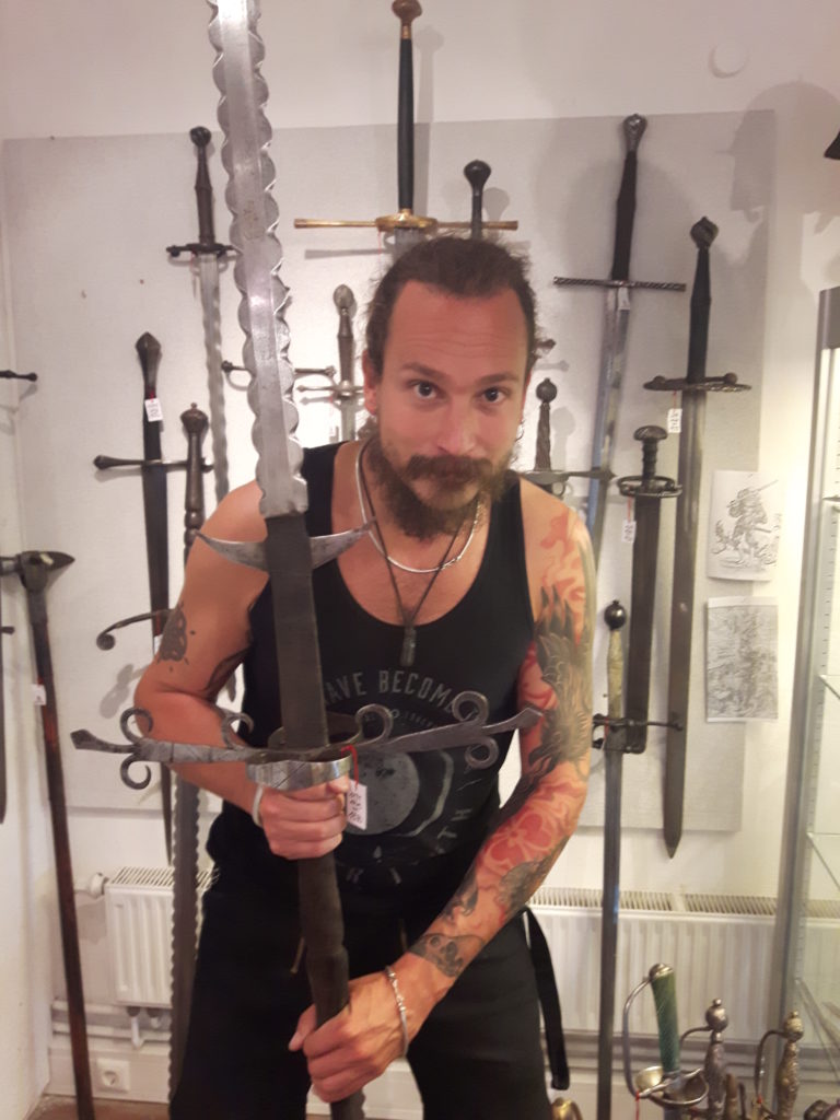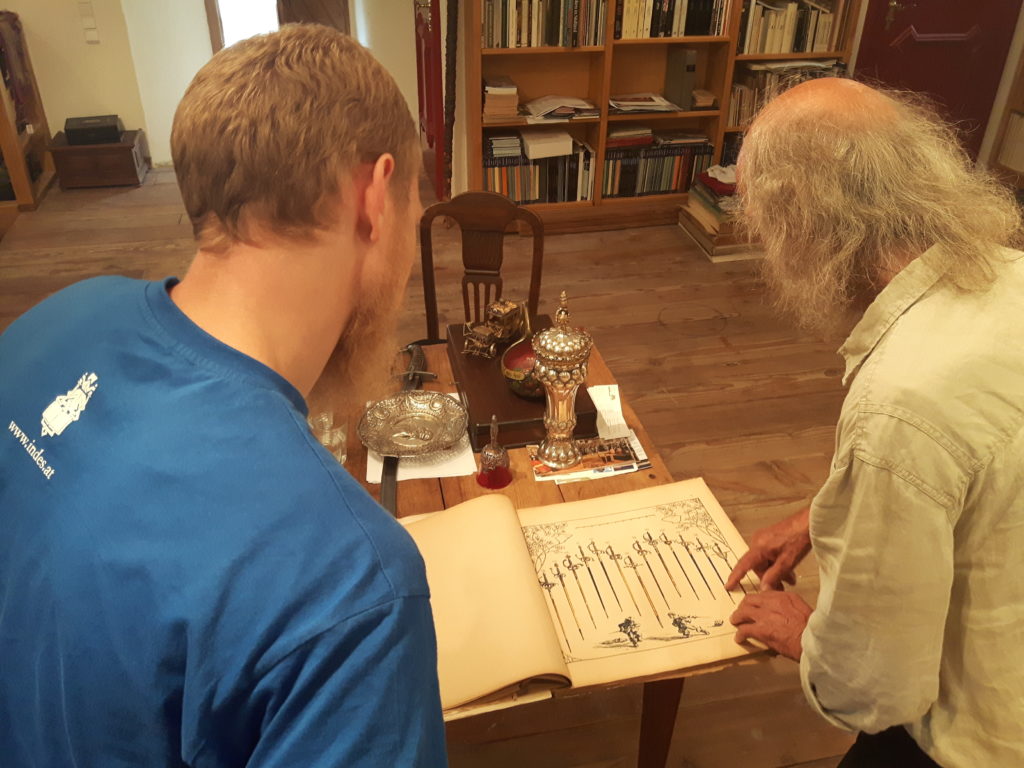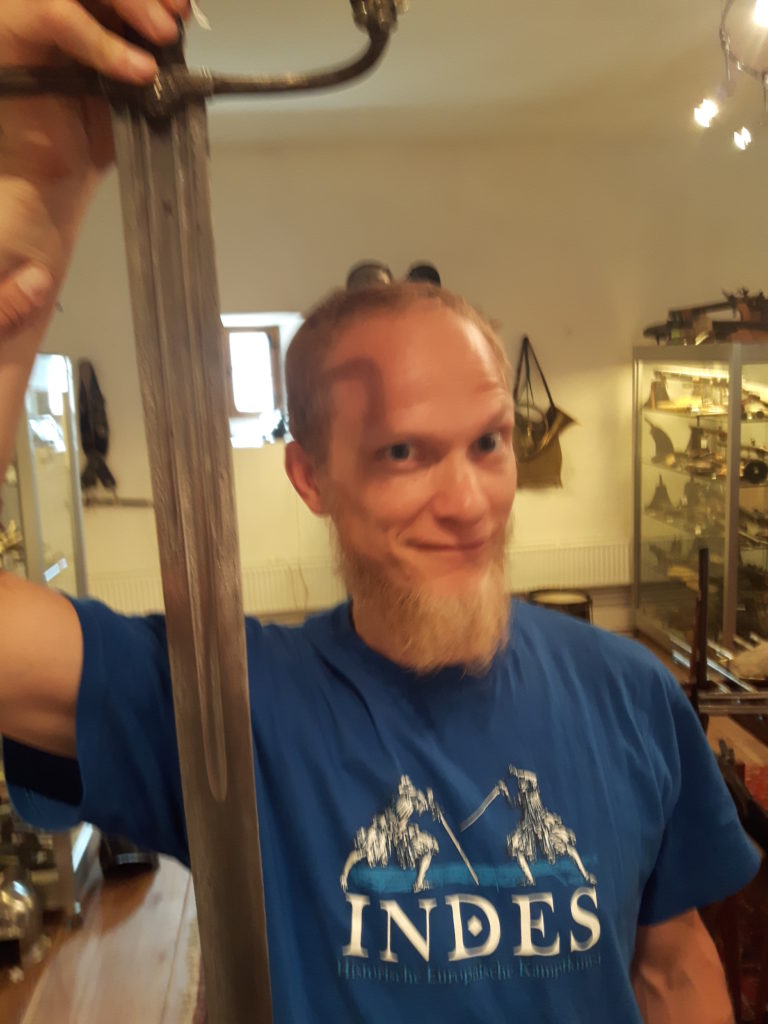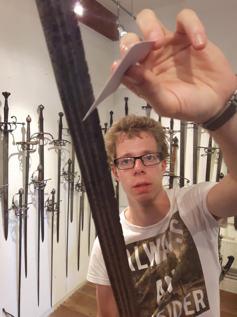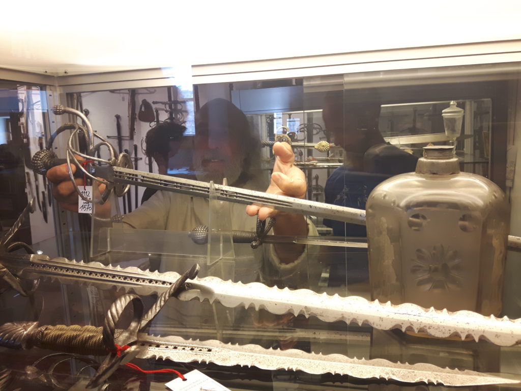 Jürgen H. Fricker hat seit seinem ersten Fund – einem halbverrosteten Säbel in einem Bach in früher Jugend – aus seiner Passion eine Profession gemacht: Er ist Sachverständiger für historische Waffen, Sammler und Händler. Getreu seinem Motto “Kunst ist die schönste Wertanlage” hat er in den vergangenen Jahren schon manch einem Schwertliebhaber zu einem originalen Sammlerstück verholfen und auch schon Museen von Deutschland bis ins ferne Japan bestückt. Jürgen öffnete seine Schatzkammer über zwei Stunden für die Swordtrip-Crew, die aus dem Sabbern nicht mehr herauskam. Anders als in anderen Sammlungen oder gar Museen hatte er auch keinerlei Berührungsängste, was das “Ausprobieren” von über 500 Jahre alten Originalen anbelangte… Worin das mündete, kann man sich vorstellen: Die drei Swordtripper und Schwertschmied Lukas Mästle-Goer (selbst HEMA-Trainer bei den Schwabenfedern), der als Verstärkung mit angereist war, probierten sich ausgiebig durch die Vitrinen. “Darf ich noch mal KURZ das xxxx da drüben??”, und “Eine letzte Frage habe ich noch…??” waren die beiden Sätze, die Jürgen gefühlte 100 Mal über sich ergehen ließ – und mit stoischer und freundlicher Contenance erwiderte.