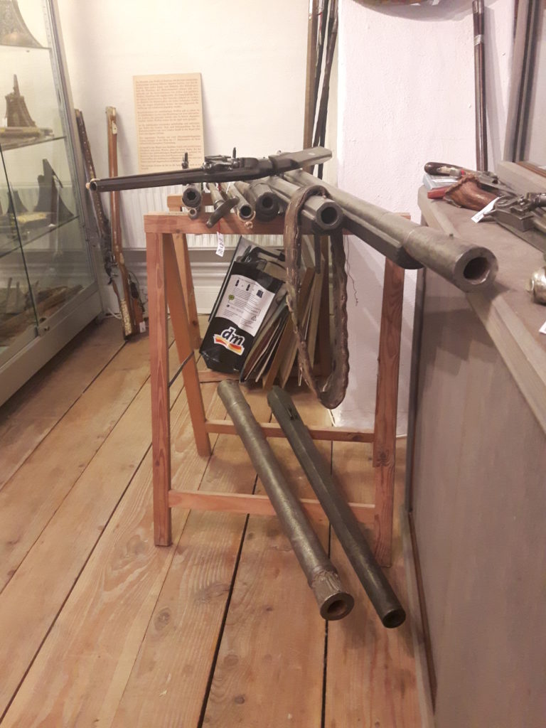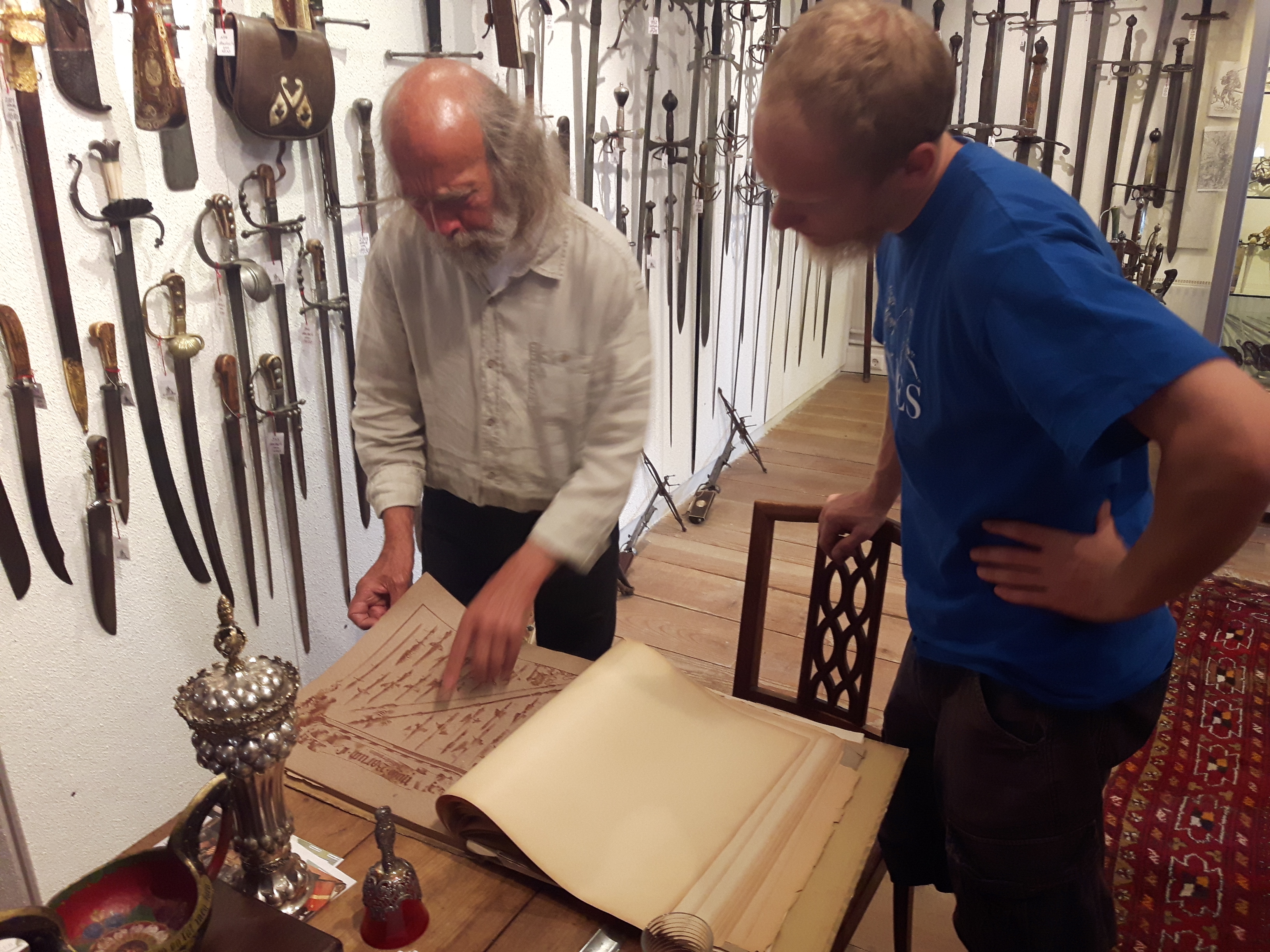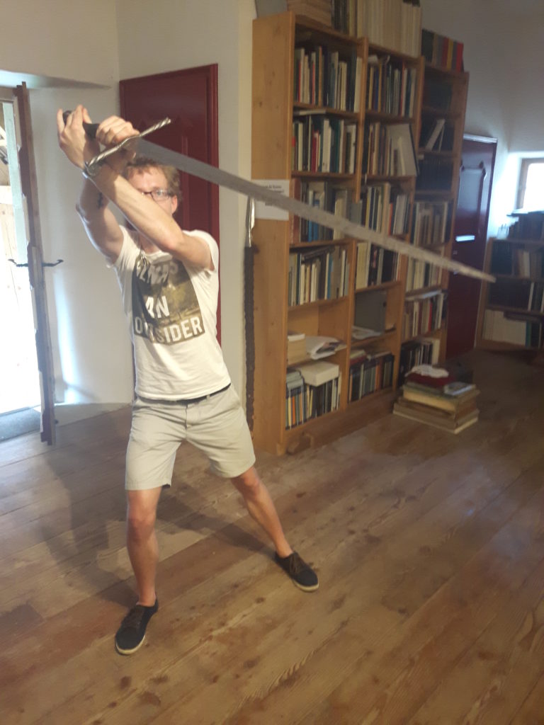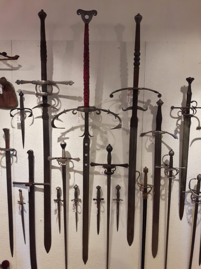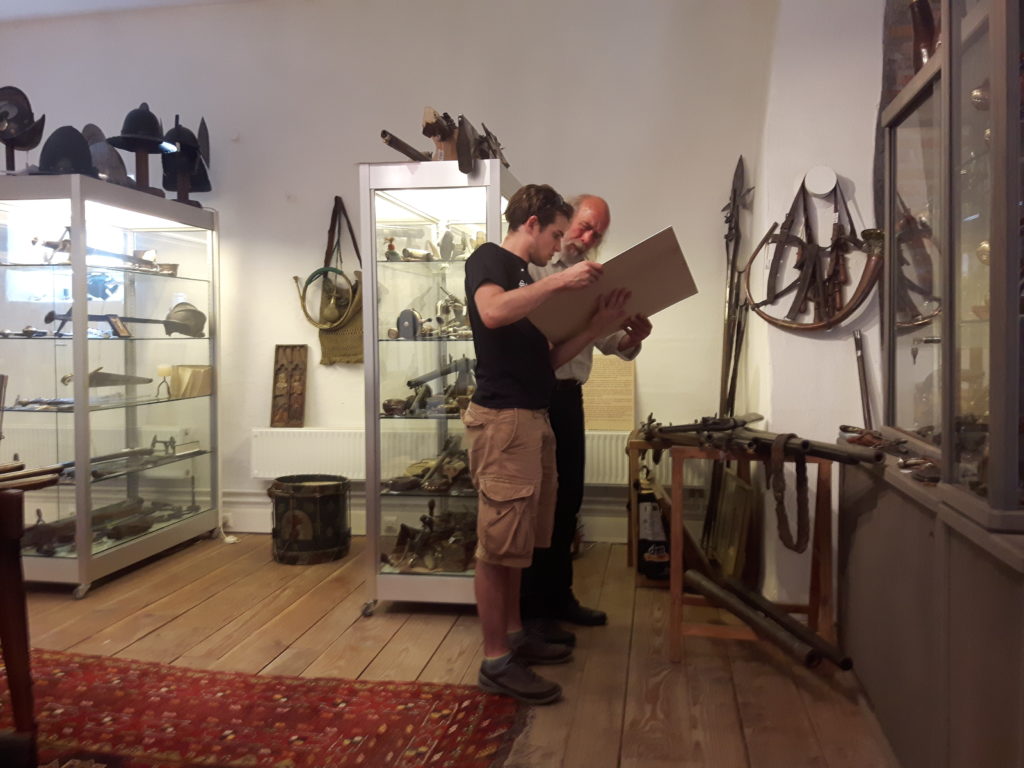 Jürgen H. Fricker hat seit seinem ersten Fund – einem halbverrosteten Säbel in einem Bach in früher Jugend – aus seiner Passion eine Profession gemacht: Er ist Sachverständiger für historische Waffen, Sammler und Händler. Getreu seinem Motto “Kunst ist die schönste Wertanlage” hat er in den vergangenen Jahren schon manch einem Schwertliebhaber zu einem originalen Sammlerstück verholfen und auch schon Museen von Deutschland bis ins ferne Japan bestückt. Jürgen öffnete seine Schatzkammer über zwei Stunden für die Swordtrip-Crew, die aus dem Sabbern nicht mehr herauskam. Anders als in anderen Sammlungen oder gar Museen hatte er auch keinerlei Berührungsängste, was das “Ausprobieren” von über 500 Jahre alten Originalen anbelangte… Worin das mündete, kann man sich vorstellen: Die drei Swordtripper und Schwertschmied Lukas Mästle-Goer (selbst HEMA-Trainer bei den Schwabenfedern), der als Verstärkung mit angereist war, probierten sich ausgiebig durch die Vitrinen. “Darf ich noch mal KURZ das xxxx da drüben??”, und “Eine letzte Frage habe ich noch…??” waren die beiden Sätze, die Jürgen gefühlte 100 Mal über sich ergehen ließ – und mit stoischer und freundlicher Contenance erwiderte.