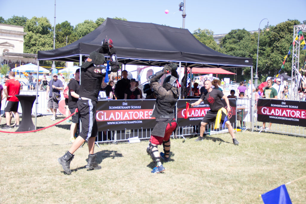 Der Tag begann schon perfekt bei Frühstück mit Alpenblick in Thomas Wohnung in Germering. Ein weiterer Höhepunkt war dann für eine kleine Abordnung noch der Besuch bei den Gladiatores München, die einen Stand beim alljährlichen M-Net-Festival am Königsplatz mit eigener Showfläche am Laufen hatten. Nach einem Fußmarsch in voller Fechtmontur samt Fechtfedern durch die Münchner Innenstadt bei gefühlt 40 Grad wurden wir von Tom Brennauer herzlich empfangen – und gleich in ein Miniturnier in der prallen Sonne eingeladen. Hat trotz der tropischen Temperaturen sehr viel Spaß gemacht sich den versierten Freifechtern der Gladiatores zu stellen – und mit Martin Betzenbichler konnte sich auch ein Local Hero als Tagessieger durchsetzen. Aber der Besuch am Königsplatz hat allen Beteiligten gezeigt: Da geht in Zukunft noch mehr zusammen! Feine Gschicht!