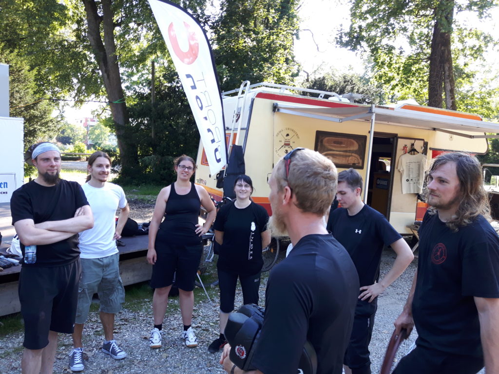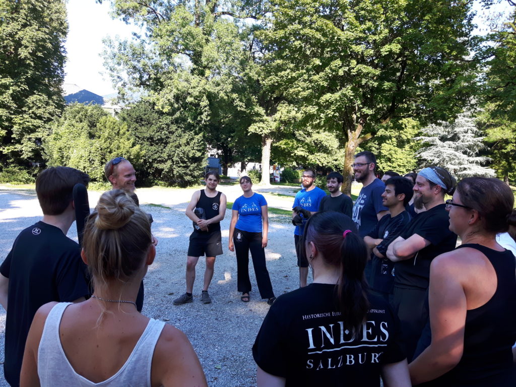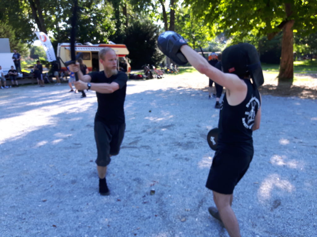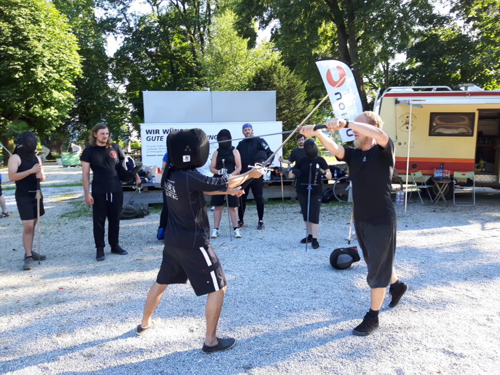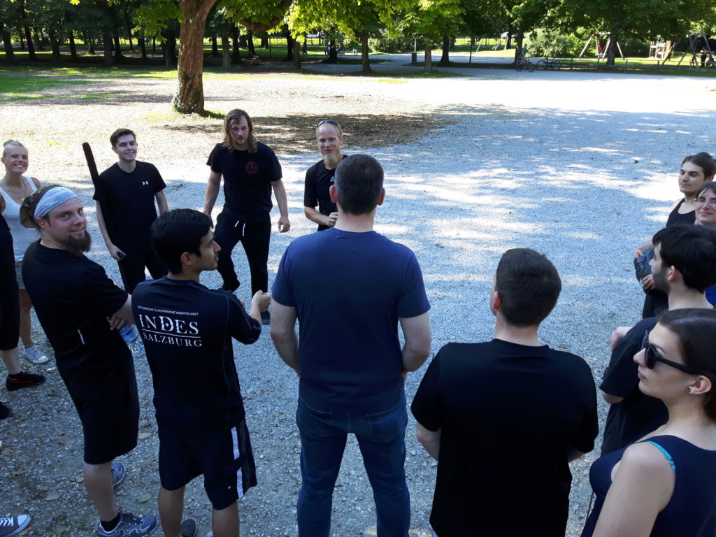 Der Trainingsnachmittag gestaltete sich als überwiegend freie Spielerei unter freiem Himmel mit einer Kurzlektion Absetzen vom Salzburger Indes-Obmann Ingulf – stark geprägt von den Trainingsinhalten bei Christian Bott in Edingen. Auch das Pratzenaufwärmen war inspiriert von einem Swordtripstopp bei Twerchhau in Berlin.